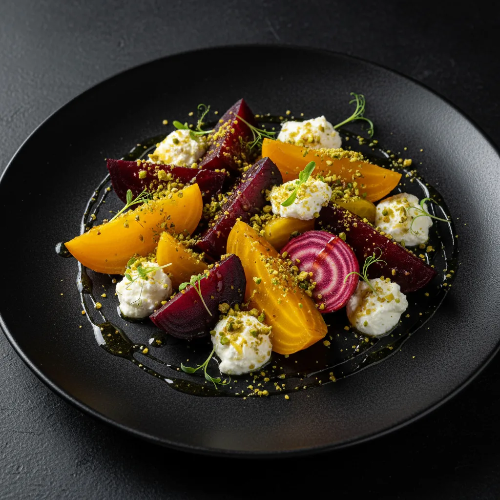 Roasted beets, honey dijon dressing, pistachio crumble, goat cheese.