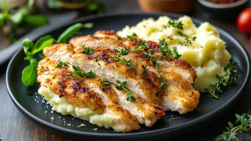 Pan seared chicken breast served with a mushroom risotto and a herb crimini sauce and seasonal vegetables.