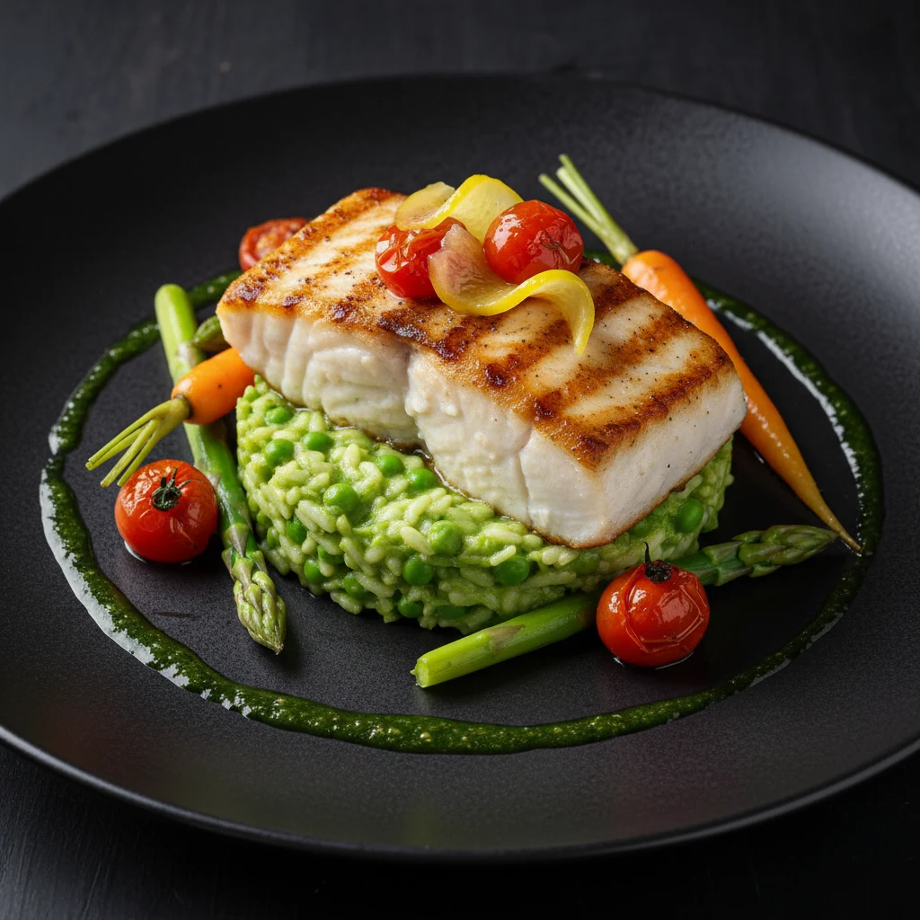pan-seared filet with preserved lemon and tomatoes, served with peas risotto and seasonal vegetables.